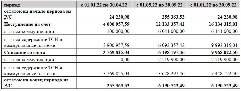 - с 1 мая 2022 года по 30 сентября 2022 года (с даты, с которой Члены Правления и Председатель ревизионной комиссии начали осуществлять контроль за движением денежных средств по расчетному счету ТСН).